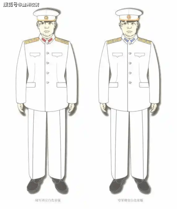 据笔者考证,这两种军装,白色的应为55式夏季常服,而棕绿色则是55式将官常服,并非因为兵种的差别。