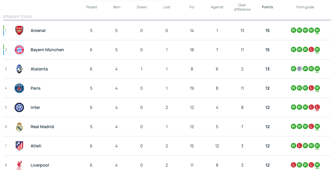 拜仁在逆转战胜葡萄牙体育后,积分来到了15分,继阿森纳之后第二个上岸,取得了至少进入附加赛的资格。