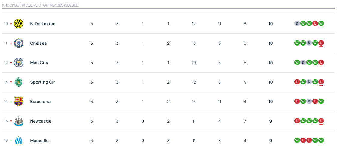 热刺赢球升第九,切尔西遭逆转降至第11,葡体降至第13,巴萨升至第14。9-16名球队中多特、曼城、纽卡未战。