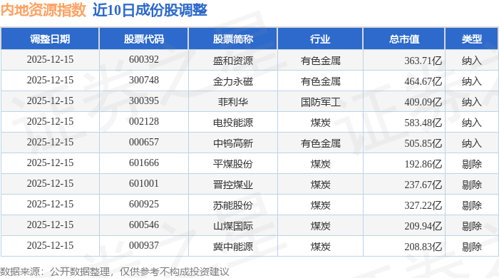 近10日内内地资源(000944)指数成份股做了调整,新纳入了5只股票,剔除了5只股票。
