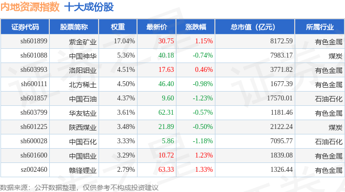 资金流向方面,内地资源(000944)指数成份股当日主力资金净流出合计10.06亿元,游资资金净流入合计7.87亿元,散户资金净流入合计2.19亿元。成份股资金流向详情见下表: