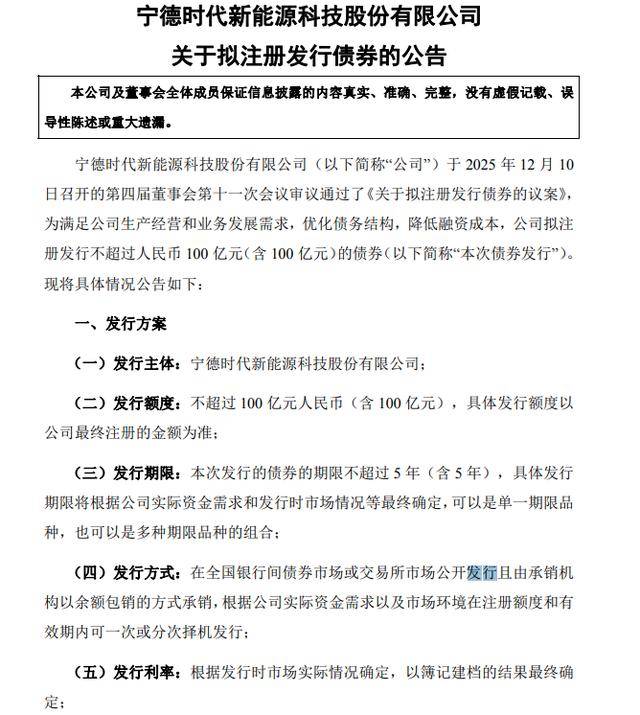 12月10日,宁德时代(300750.SZ)发布公告,公司拟注册发行不超过100亿元的债券,募集资金用于项目建设、补充营运资金、偿还有息负债等。本次发行的债券期限不超过5年,发行方式为公开发行且由承销机构以余额包销的方式承销。此外,公司董事会提请股东会授权总经理或其授权人士全权办理与本次债券发行工作的相关事宜。