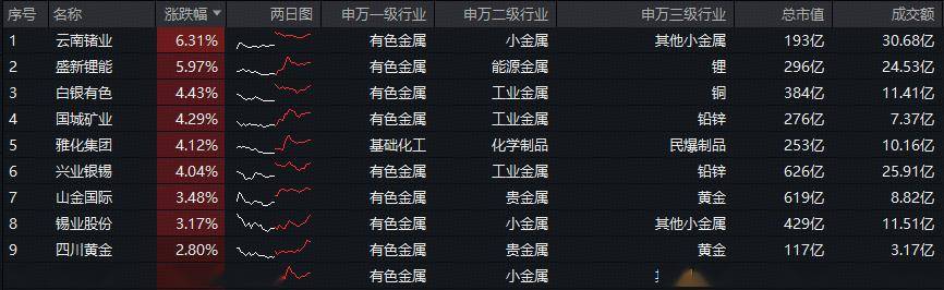 细分方向来看,直接配套低轨卫星组网需求,专注空间太阳能电池用锗晶片建设项目,国内锗产业链最完整、产销量第一的云南锗业领涨超6%;受益于锂电池板块走强,锂业龙头盛新锂能涨近6%;黄金股亦有亮眼表现,山金国际涨超3%,四川黄金涨逾2%。权重股紫金矿业、中国铝业涨逾1%。