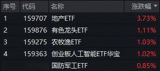 盘面上,地产午后直线上攻,全市场唯一跟踪中证800地产指数的地产ETF(159707)收涨3.73%领涨全市场;有色金属板块逆市活跃,揽尽有色金属行业龙头的有色龙头ETF(159876)场内价格劲涨1.11%;农牧渔板块掀涨停潮,全市场唯一农牧渔ETF(159275)场内价格大涨1.03%;AI产业链继续上攻,光模块CPO含量超56%的创业板人工智能ETF华宝(159363)再刷上市新高;商业航天概念反复活跃,高人气国防军工ETF(512810)场内收涨0.85%,收盘价创近一个月新高。