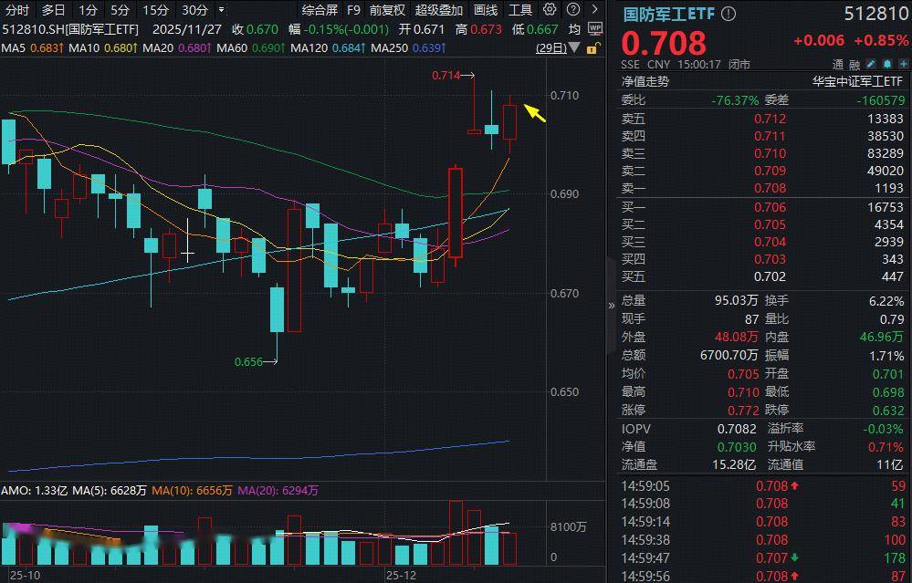 参与把握商业航天投资机遇,配置工具关注国防军工ETF(512810)。代码有“八一”的国防军工ETF(512810)覆盖『商业航天 + 低空经济 + 可控核聚变 + 大飞机 + 深海科技 + 军用AI』等诸多热门主题,同时是融资融券+互联互通标的,是一键投资国防军工核心资产的高效工具。