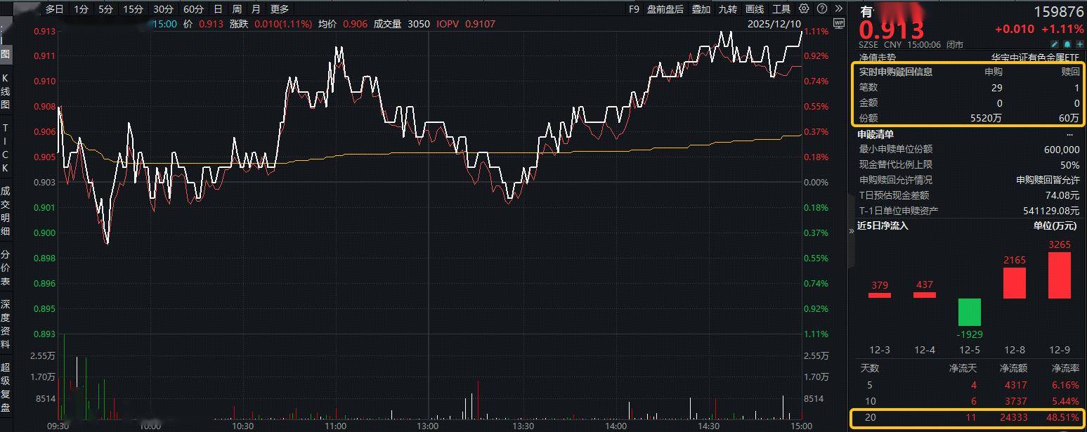 二、今夜!美联储降息无悬念?有色龙头ETF(159876)逆市劲涨1%受资金追捧,全天获净申购5460万份!