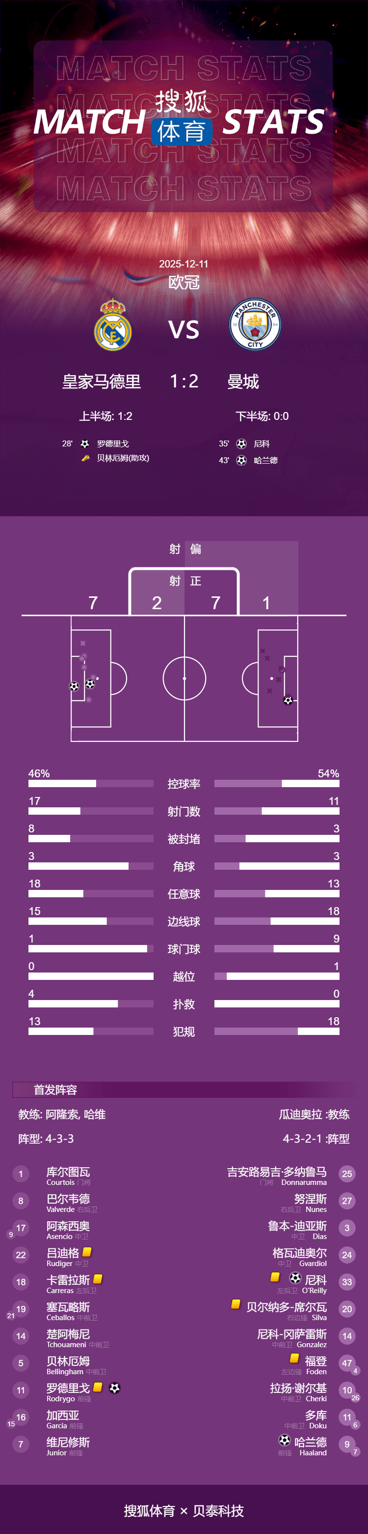 北京时间12月11日凌晨4点,2025-2026赛季欧冠联赛阶段第6轮展开一场“天王山战”,皇马坐镇主场对阵曼城。上半场,贝林厄姆助攻,罗德里戈破门打破个人进球荒。格瓦迪奥尔头球攻门造成库尔图瓦扑救脱手,奥赖利补射扳平比分。随后,吕迪格抱摔哈兰德送点,挪威神锋主罚命中帮助蓝月亮反超。下半场,卡雷拉斯传中,恩德里克头球攻门击中横梁错失扳平良机。本场比赛,姆巴佩因伤未登场。最终,曼城客场2-1逆转皇马,蓝月在收获各项赛事4连胜的同时送给了银河战舰各赛事两连败。