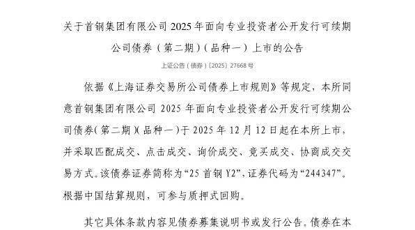 依据《上海证券交易所公司债券上市规则》等规定,上交所同意首钢集团有限公司2025年面向专业投资者公开发行可续期公司债券(第二期)(品种一)于2025年12月12日起在上交所上市,并采取匹配成交、点击成交、询价成交、竞买成交、协商成交交易方式。该债券证券简称为“25首钢Y2”,证券代码为“244347”。根据中国结算规则,可参与质押式回购。