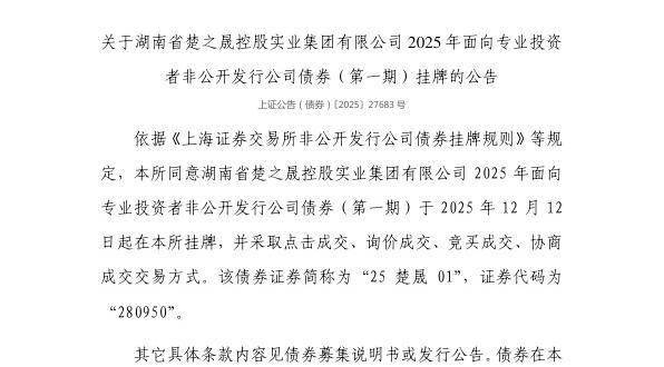 12月11日,上交所发布关于湖南省楚之晟控股实业集团有限公司2025年面向专业投资者非公开发行公司债券(第一期)挂牌的公告。