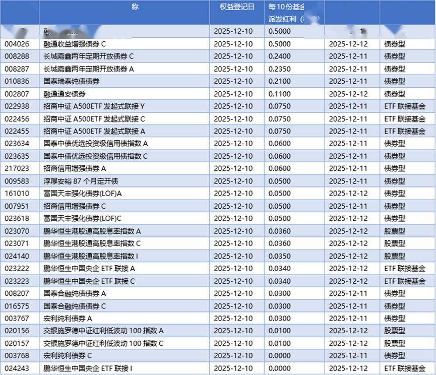 (1)12月10日新发基金共有5只,主要为基金中的基金(FOF)基金和混合型基金;基金分红28只,多为债券型,派发红利最多的基金是融通收益增强债券型证券投资基金,每10份基金份额派发红利0.5000元;