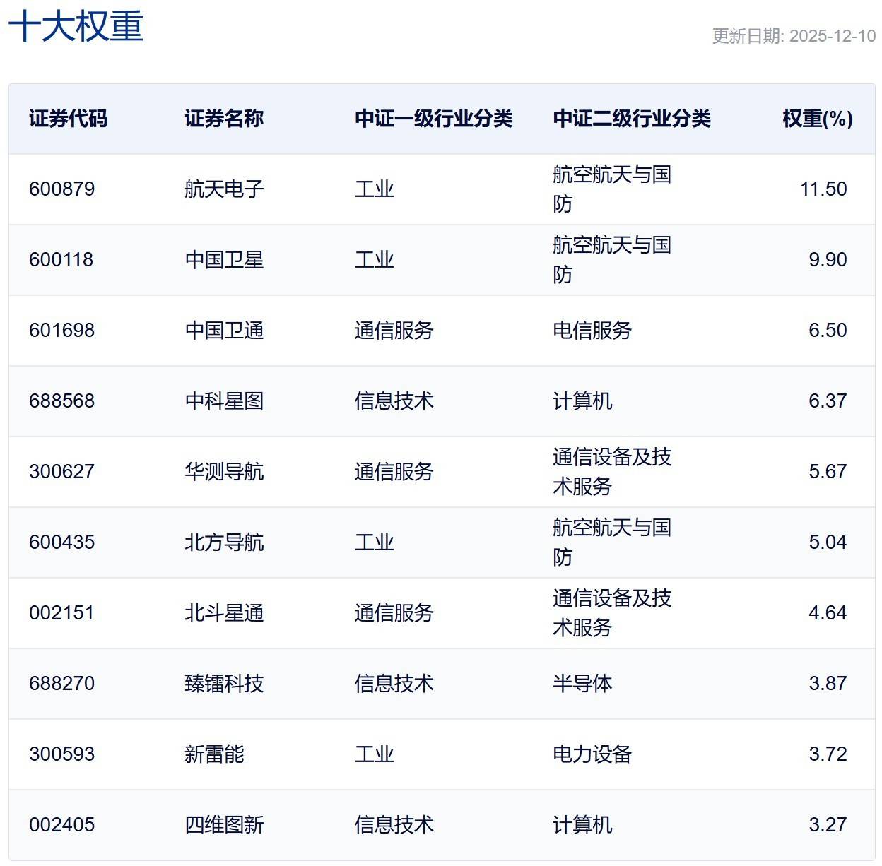 中证卫星产业指数选取50只业务涉及卫星制造、卫星发射、卫星通信、卫星导航、卫星遥感等领域的上市公司证券作为指数样本,反映卫星产业上市公司证券的整体表现。