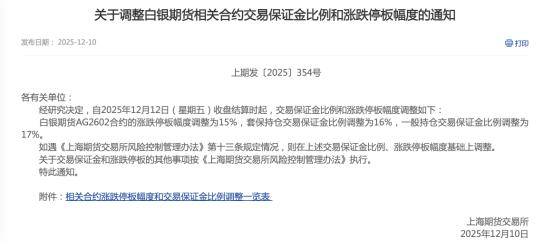 12月10日晚,上海期货交易所(下称“上期所”)发布通知,调整白银期货相关合约的交易保证金比例及涨跌停板幅度,以应对近期市场波动并强化风险防控。