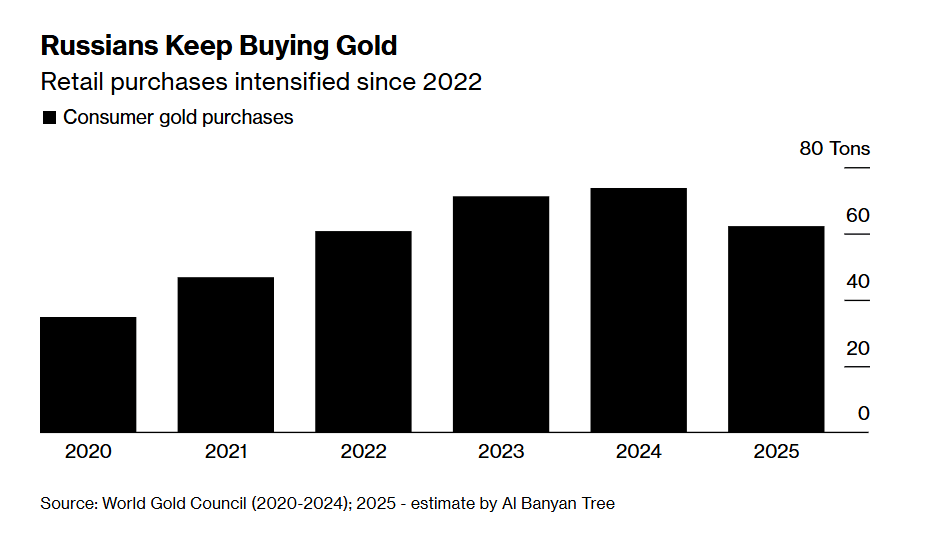 有研究指出,今年俄罗斯消费者对金条、金币和首饰等零售黄金的购买量预计将达到62.2吨,约合200万盎司。俄罗斯的金融机构也在购买黄金——有分析指出,到2025年8月,他们持有的黄金规模达57.6吨。