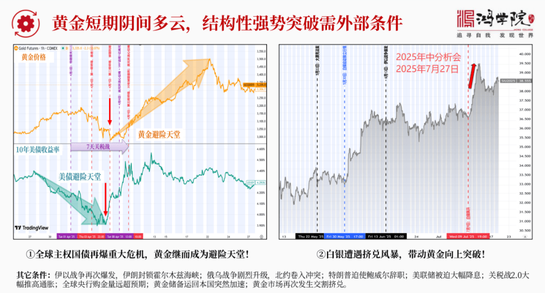 鸿学院曾在年中分析会上预测2025年下半年,黄金突破,需要外部条件——白银遭遇挤兑风暴,带动黄金向上突破!如今已应验。