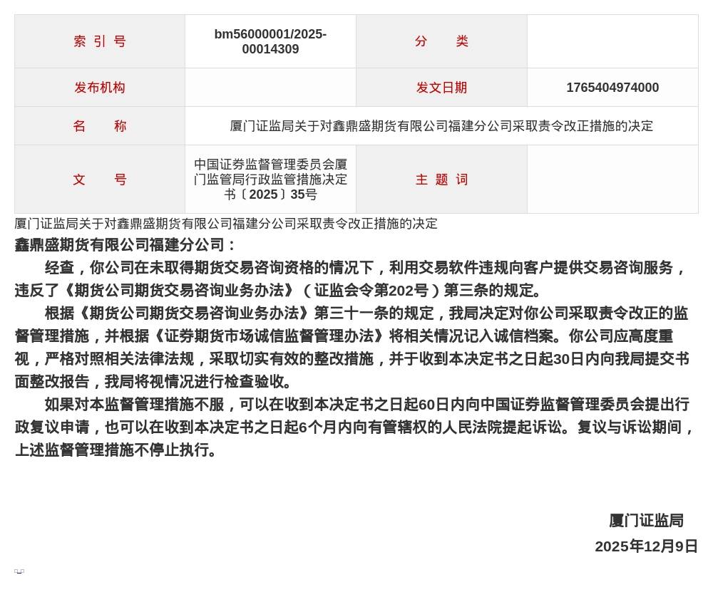 针对以上问题,厦门证监局决定对鑫鼎盛期货有限公司福建分公司采取责令改正的监督管理措施,并根据《证券期货市场诚信监督管理办法》将相关情况记入诚信档案。