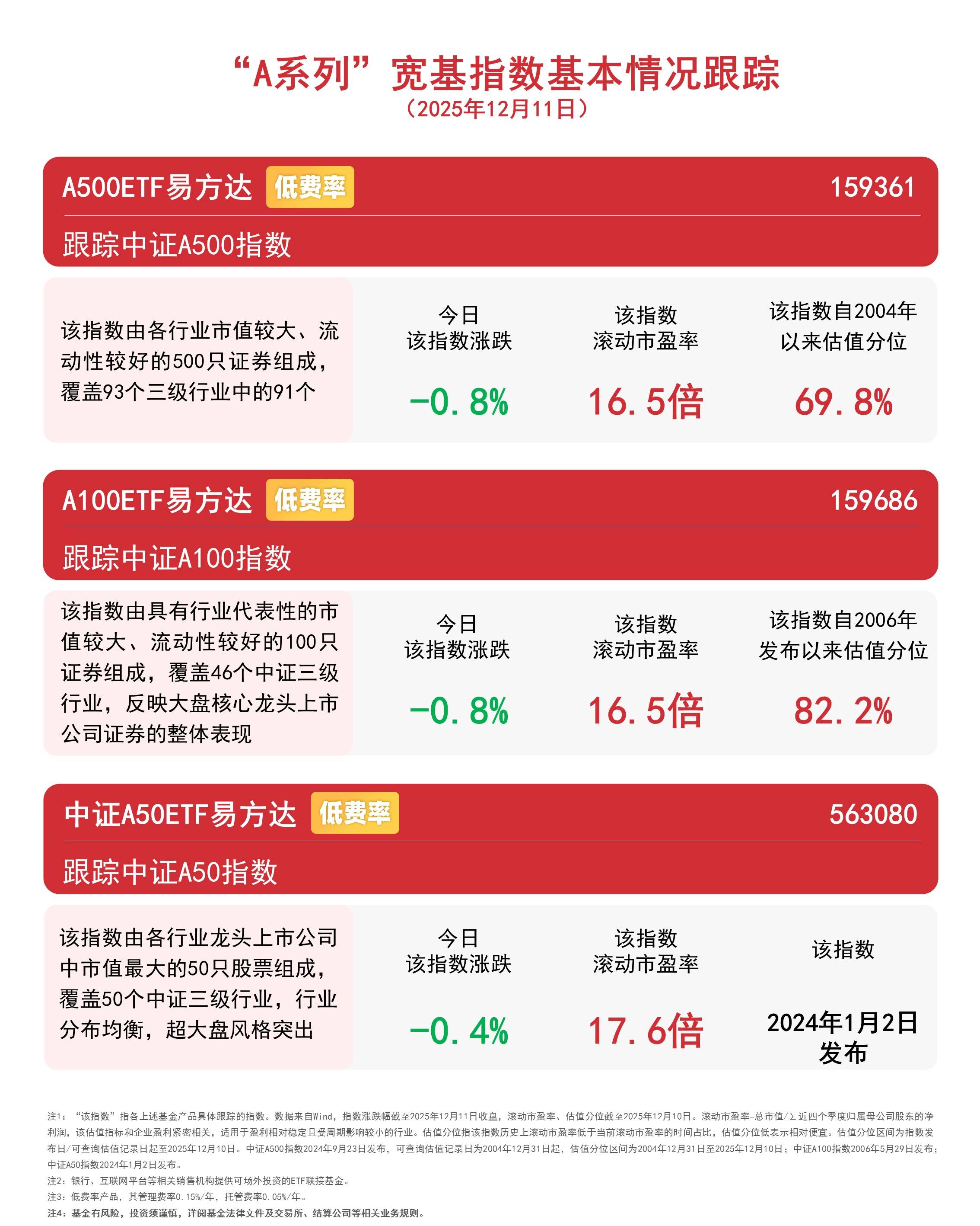 截至收盘,中证A500指数、中证A100指数均下跌0.8%,中证A50指数下跌0.4%,相关产品交投活跃,其中A500ETF易方达(159361)全天成交额超50亿元,净申购超3.7亿份。