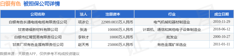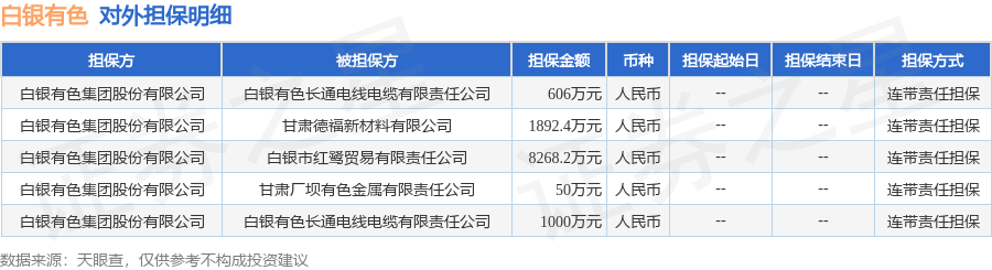 白银有色12月10日披露5笔对外担保,被担保公司4家。对外担保明细如下表: