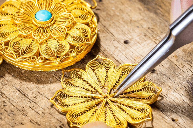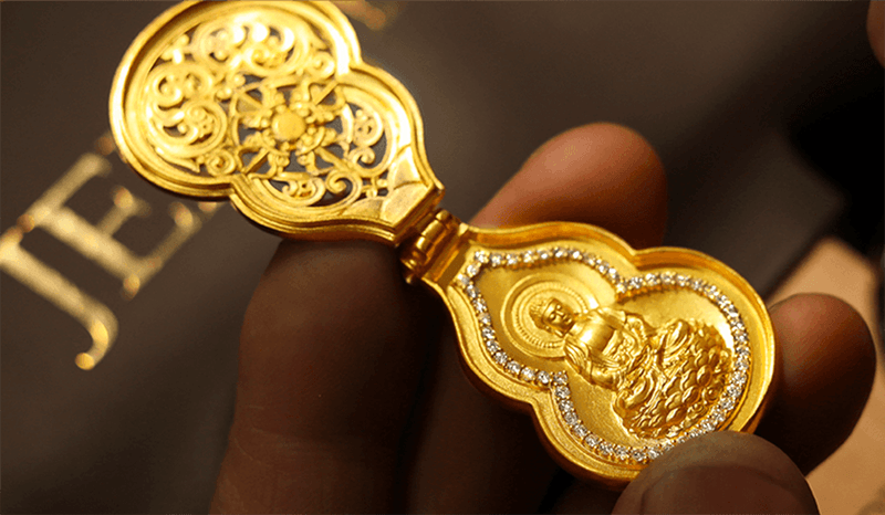 古法,指中国宫廷古法制金工艺,即采用花丝、錾刻、镶嵌、烧蓝等工艺加工制作足金饰品,其中的“花丝镶嵌”“金银错”技艺于2008年被列入了国家非物质文化遗产名录。