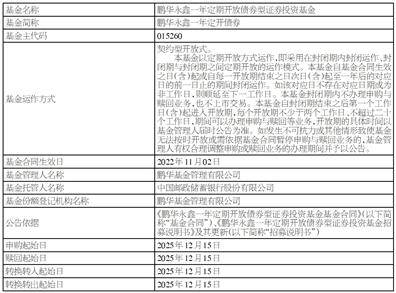 鹏华永鑫一年定期开放债券型证券投资基金(以下简称“本基金”)自2025年12月15日起(含当日)进入开放期,其中开放申购时间为2025年12月15日至2026年01月13日,在此期间接受投资者的申购和转换转入业务申请;开放赎回时间为2025年12月15日至2026年01月09日,在此期间接受投资者的赎回和转换转出业务申请。