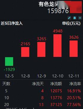 截至昨日(12月11日)揽尽有色金属行业龙头的有色龙头ETF(159876)近4日连续吸金,合计金额1.4亿元,拉长时间来看,近20日累计吸金3.71亿元,反映资金看好有色金属板块后市表现,积极进场抢筹