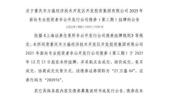 依据《上海证券交易所非公开发行公司债券挂牌规则》等规定,上交所同意重庆市万盛经济技术开发区开发投资集团有限公司2025年面向专业投资者非公开发行公司债券(第三期)于2025年12月15日起在上交所挂牌,并采取点击成交、询价成交、竞买成交、协商成交交易方式。该债券证券简称为“25万盛04”,证券代码为“280956”。