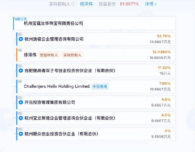 此外,徐泽伟还担任新成立的融资主体杭州宝蕴兰华珠宝有限责任公司的董事长,该公司在今年8月28日注册,注册资本为138.88万元,徐泽伟在该公司担任董事长及法定代表人,并持有约60% 的股份。这一架构也表明,徐泽伟或已全面掌舵寶蘭品牌的现有业务与未来资本化发展。