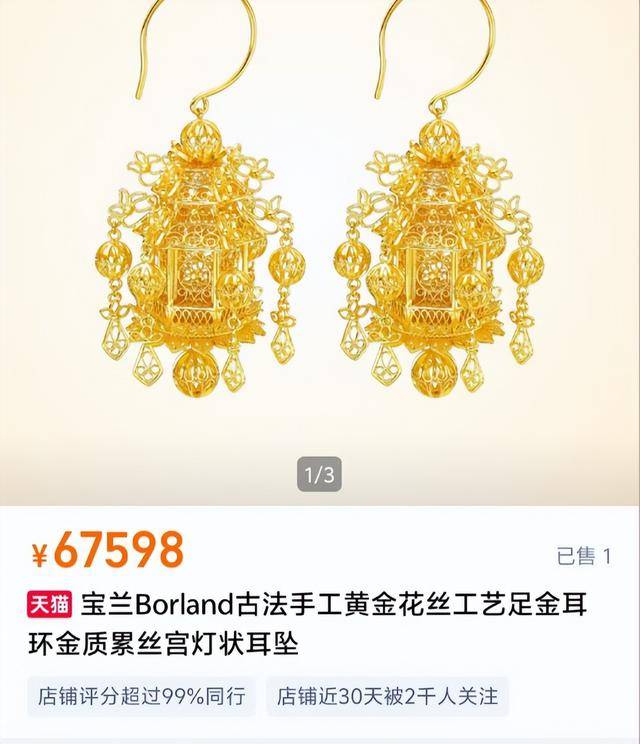 经《贵圈》栏目测算,寶蘭多款产品的单克售价已逼近甚至超过2000元人民币。以一款重约34克的古法手工黄金花丝工艺足金宫灯耳坠为例,其售价高达67598元,经折算其单克价格约为1988元;一款65.14克的古法工艺足金累丝手镯,售价更是达到125718元,经折算其单克价格约为1930元。即便以近期约1328元/克的常规金价为基准计算,其品牌溢价率也已达到50%以上。