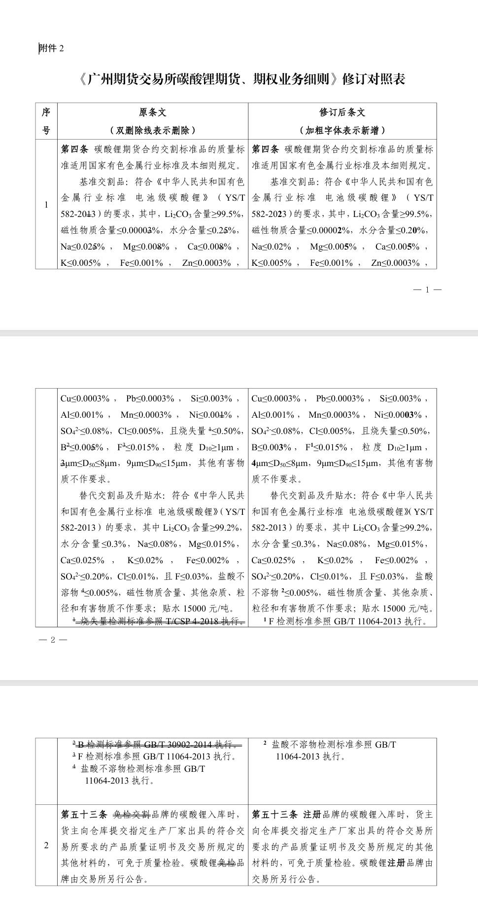 12月12日,广州期货交易所发布通知,《广州期货交易所碳酸锂期货、期权业务细则》的修改已由广州期货交易所董事会审议通过,并报告中国证监会,现予以发布。其中,第四条的修改适用于碳酸锂LC2612合约及以后合约,第五十三条的修改自2025年12月12日起实施。