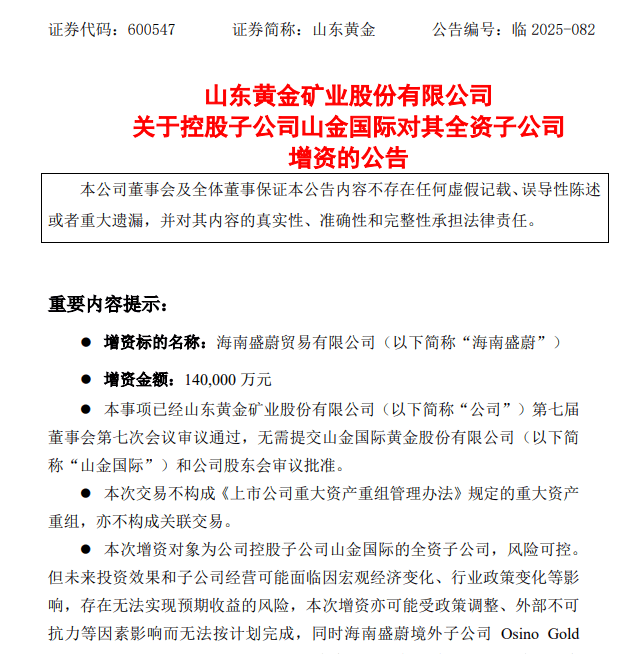 海南自贸港封关在即的政策契机下,山东黄金持续加大在琼投资力度。12月8日,山东黄金公告显示,其董事会审议通过控股子公司山金国际对全资子公司海南盛蔚增资14亿元的议案,资金全部计入资本公积,增资后山金国际仍持有海南盛蔚100%股权。此次增资核心聚焦两大目标,一方面增强海南盛蔚经营实力,保障其境外子公司Osino Gold Mining and Exploration(Pty)Ltd.项目建设推进,另一方面有效降低海南盛蔚资产负债率,提升其资金运营能力。