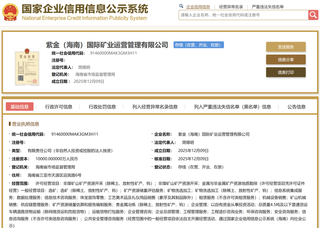 企业布局动作同步落地,国家企业信用信息公示系统显示,12月9日紫金(海南)国际矿业运营管理有限公司正式成立,注册资本1亿元,由紫金矿业全资持股,经营范围涵盖非煤矿山矿产资源开采、地质勘探等核心业务。邹来昌透露,未来紫金矿业还将在海南适时开展黄金精深加工业务,拓展贸易及国际市场业务,深化国际合作,为海南自贸港建设及黄金产业高质量发展赋能。