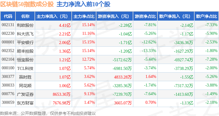 资金流向方面,区块链50(399286)指数成份股当日主力资金净流入合计7.21亿元,游资资金净流出合计5.46亿元,散户资金净流出合计1.74亿元。成份股资金流向详情见下表: