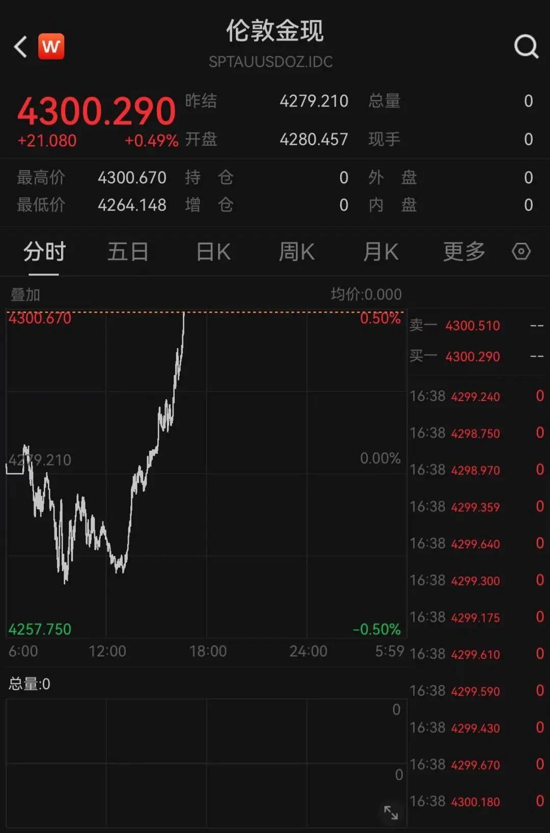 北京时间12月12日, 现货黄金(伦敦金现)下午强势拉涨,盘中突破4300美元,刷新50天新高。截至发稿,报4300.290美元/盎司,涨0.49%,COMEX黄金期货同步上涨,报4323.2美元/盎司。