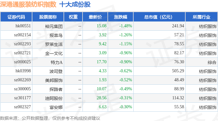 深港通服装纺织(983041)指数十大成份股详情如下: