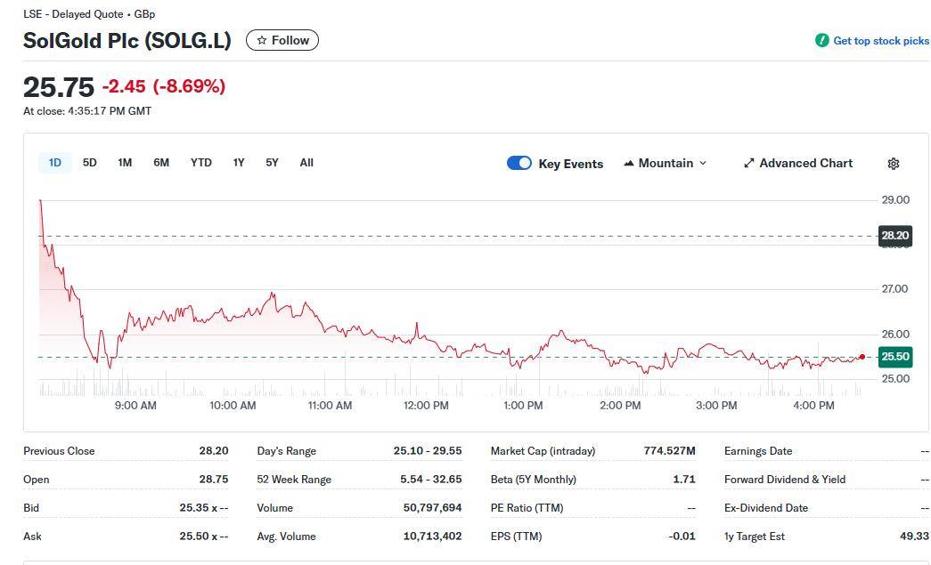 尽管收购报价提高,SolGold股价周五仍大跌,早盘刷新日低至25.1便士,日内跌约11%,此后跌幅略为收窄到9%以内,仍处于26便士下方,低于江西铜业的报价,反映投资者对大宗矿业收购交易的谨慎态度。该收购仍需中国监管部门对境外投资的审批,江西铜业已启动相关程序。