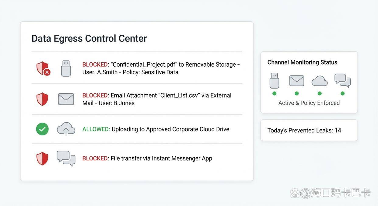 它能管住所有“出口”:员工想通过U盤、电子邮件、网盘、甚至微信发送文件?系统会根据您的策略进行判断。非法的、越权的外发行为会被直接阻止,并记录在案。