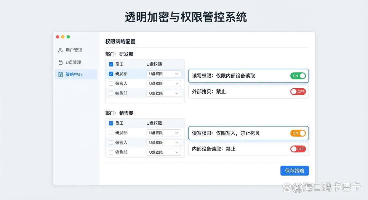 透明加密与权限管控:它不是简单地给U盘加个密码,而是从底层对数据进行透明加密。管理员可以根据部门和员工职级,精细化地设置每个U盘的读写权限,比如“研发部的U盘只能在公司内部电脑读取”、“销售部的U盘只能写入,不能拷贝走内部资料”等。
