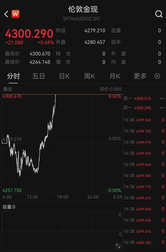 北京时间12日,现货黄金(伦敦金现)下午强势拉涨,盘中突破4300美元,刷新50天新高。截至发稿,报4300.290美元/盎司,涨0.49%,COMEX黄金期货同步上涨,报4323.2美元/盎司。