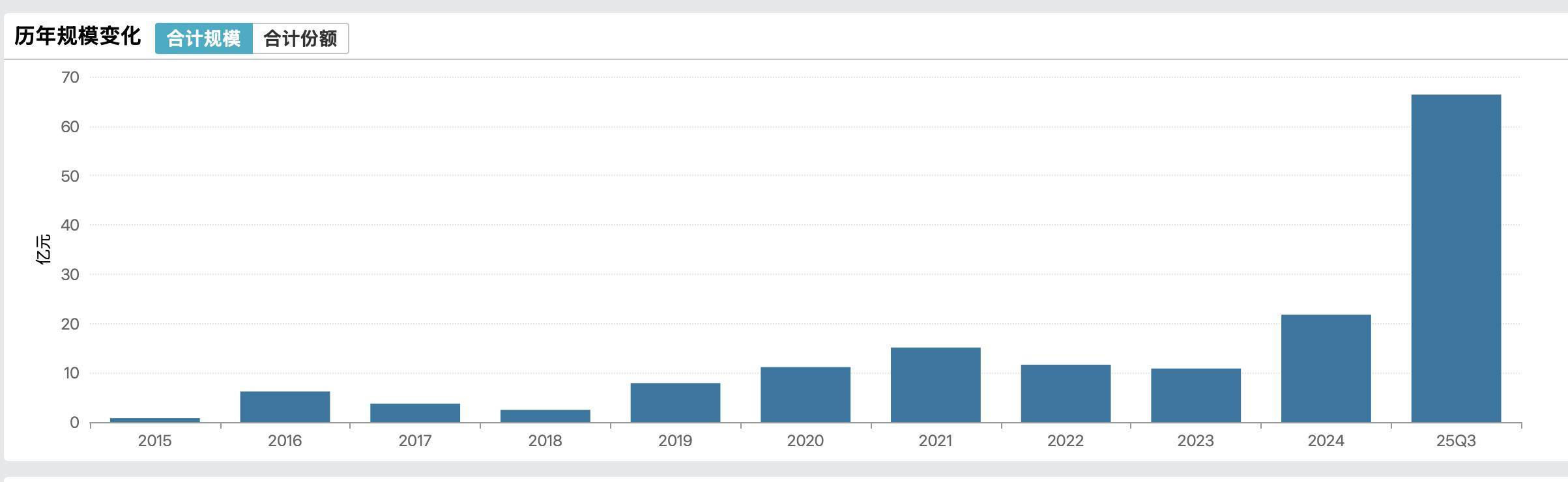 Wind数据显示,该基金成立以来,2015年~2024年,规模一直处于30亿元以下,不过今年受白银涨势影响,规模迎来了爆发。截至今年9月末,国投瑞银白银期货LOF规模合计为66.40亿元,较年初增加44.62亿元,增幅达到204.87%。其中国投瑞银白银期货(LOF)A规模达到43.47亿元,较年初增长161.08%。