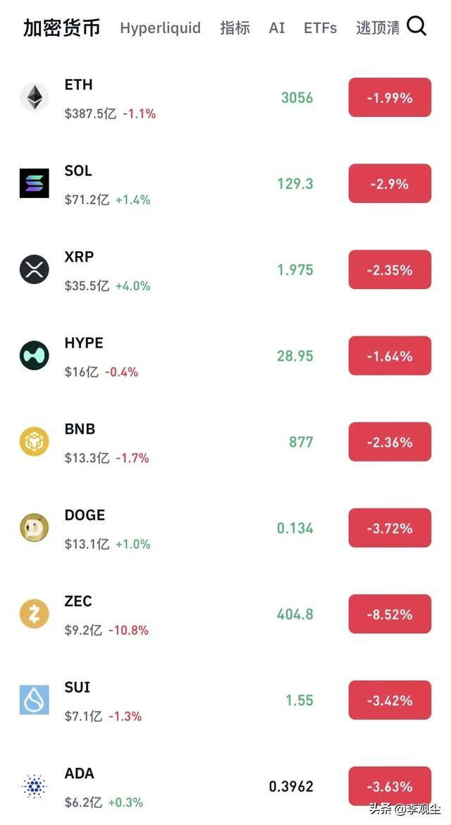 以太坊、SOL等主流币种紧随其后纷纷跟跌,狗狗币、BNB等热门币种更遭遇重挫,整个市场陷入集体回调的低迷氛围。