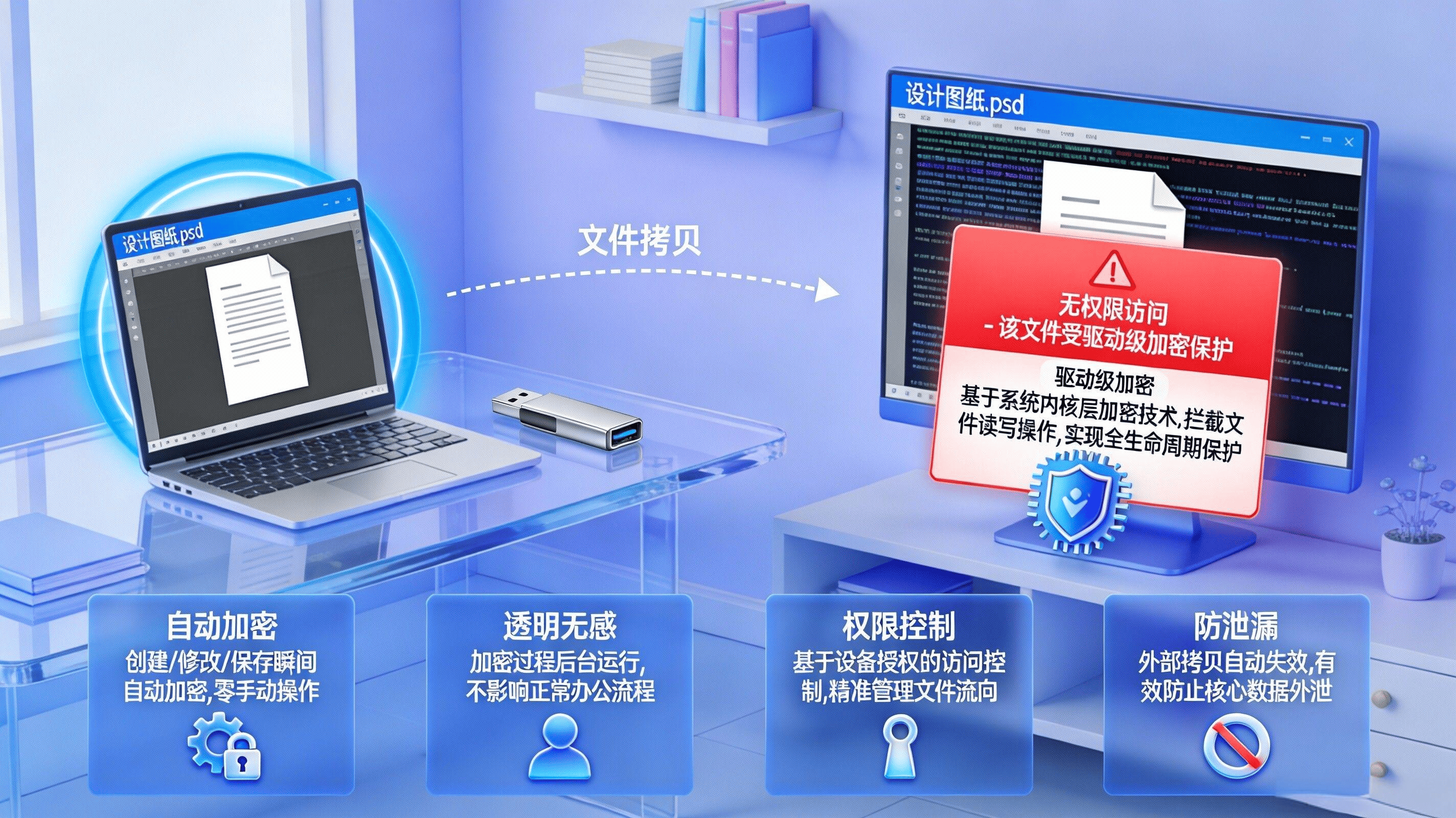 采用驱动层透明加密技术,设计师在CAD软件中创建、编辑图纸时自动加密,无需手动操作或改变工作习惯。加密文件脱离授权环境即无法打开,即使U盘拷贝或邮件外发,未授权设备仅显示乱码,从源头阻断泄露风险。