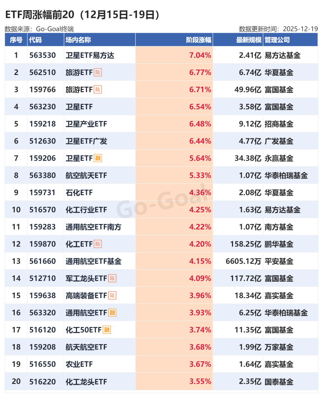 Go-Goal ETF数据显示,卫星、通用航空、航空航天等相关ETF本周表现强势,卫星ETF易方达涨幅居首。旅游、化工、石化等相关ETF品种同样受到资金关注。跌幅方面,芯片、半导体类ETF跌幅居前。