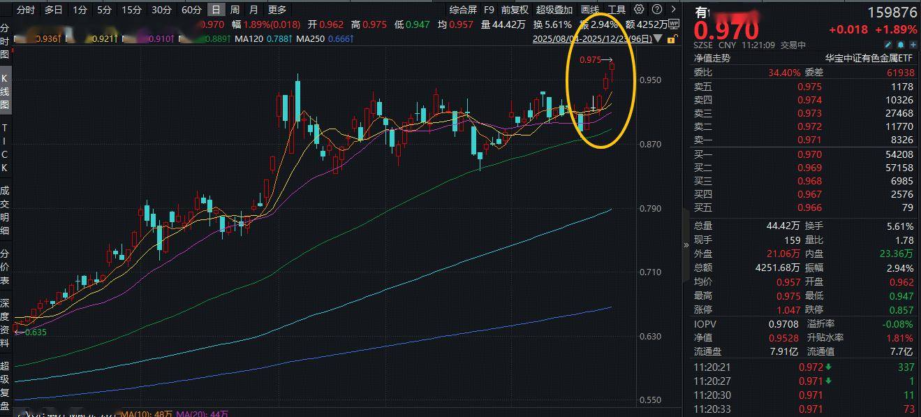 12月23日早盘,有色金属板块领涨两市,同标的指数规模最大的有色ETF华宝(159876)场内价格盘中涨超2.3%,现涨1.89%,刷新ETF上市以来的高点!