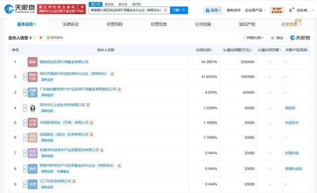 天眼查工商信息显示,近日,粤港澳大湾区创业投资引导基金合伙企业(有限合伙)成立,执行事务合伙人为深润国创(深圳)投资有限公司,出资额450.5亿人民币,经营范围为以私募基金从事股权投资、投资管理、资产管理等活动。合伙人信息显示,该基金由国家创业投资引导基金有限公司、深圳市国创引科创投资合伙企业(有限合伙)、广东省战略性新兴产业投资引导基金有限责任公司等共同出资。