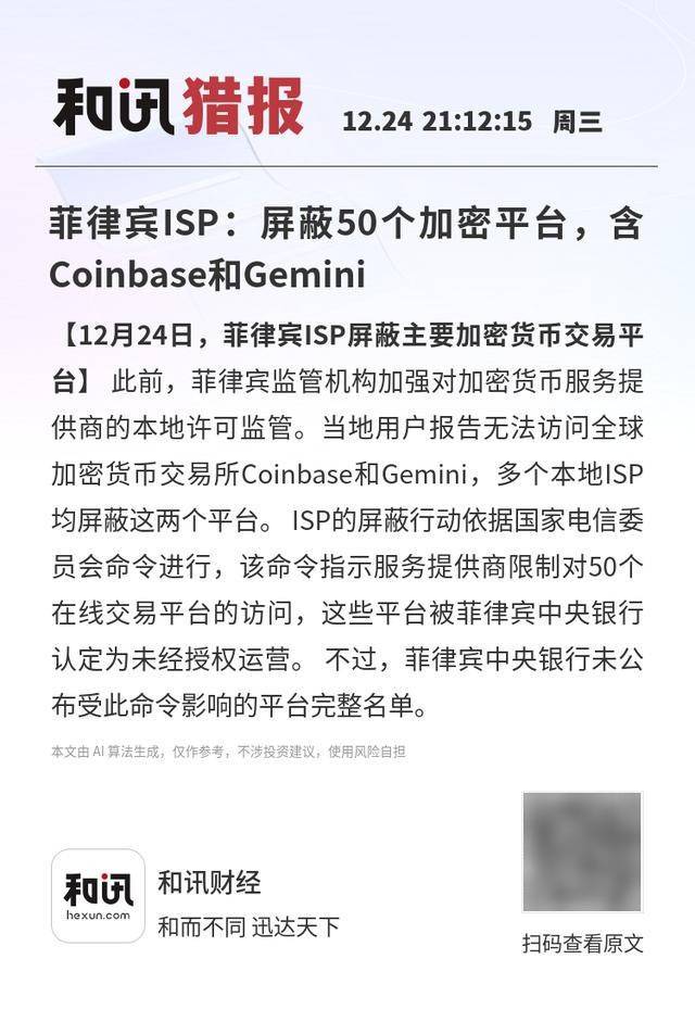 【12月24日,菲律宾ISP屏蔽主要加密货币交易平台】此前,菲律宾监管机构加强对加密货币服务提供商的本地许可监管。当地用户报告无法访问全球加密货币交易所Coinbase和Gemini,多个本地ISP均屏蔽这两个平台。 ISP的屏蔽行动依据国家电信委员会命令进行,该命令指示服务提供商限制对50个在线交易平台的访问,这些平台被菲律宾中央银行认定为未经授权运营。 不过,菲律宾中央银行未公布受此命令影响的平台完整名单。