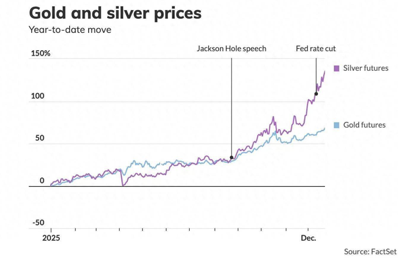 这轮黄金上涨,直接源于美联储近期的降息政策,以及市场对债务货币化的担忧。所谓债务货币化,就是央行通过购买政府债券(即印钞)来推高通货膨胀,从而达到偿还债务的目的。前高盛首席货币策略师罗宾·布鲁克斯指出,美联储主席鲍威尔在8月的杰克逊霍尔年会上发表的鸽派言论,以及12月10日美联储降息25个基点的决策,都是导致黄金价格突破的关键因素。