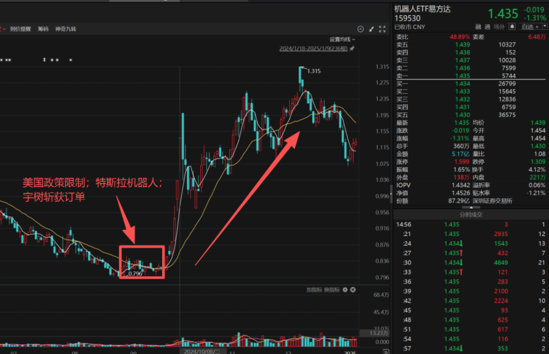 9月24日,机器人ETF易方达在前期底部附近上涨3.67%,且突破20日均线,受大行情的刺激,随后51个交易日大涨56%。