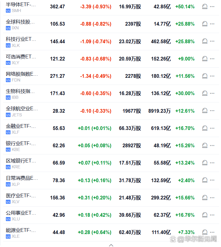 【行业ETF美股盘初涨跌各异】半导体ETF跌0.93%,全球科技股指数ETF、科技行业ETF、网络股指数ETF等至多跌0.82%,医疗业ETF则涨0.2%,能源业ETF涨0.74%。