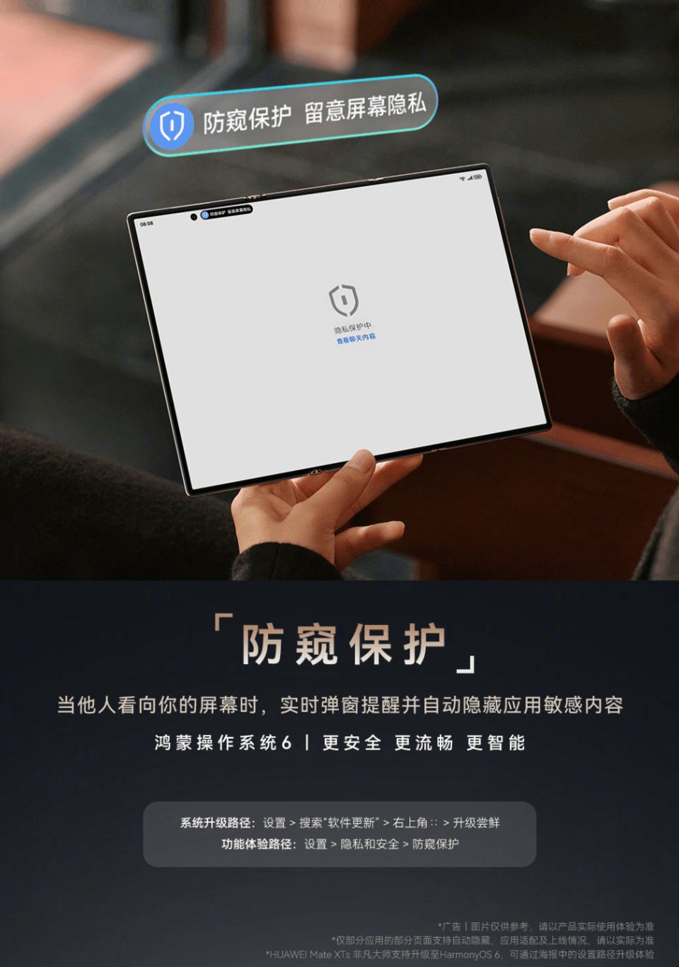 这就是“事中干预”的典型场景。HarmonyOS 6利用前置感知能力,实时监测屏幕前的视线。当系统发现有非机主的目光注视时,它会像拉起窗帘一样,瞬间将敏感信息模糊化。这种体验是无感且优雅的,你不需要手忙脚乱地锁屏,也不需要用手遮挡,系统自动为你维护了社交距离和隐私尊严。