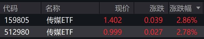受盘面影响,传媒ETF涨近3%。