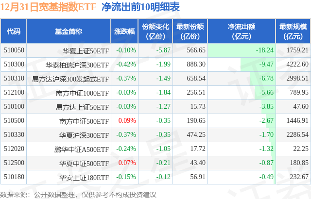 当日有88只宽基指数ETF基金出现资金净流出,其中净流出排首位的是华夏上证50ETF(510050),份额减少了5.87亿份,净流出额为18.24亿元。